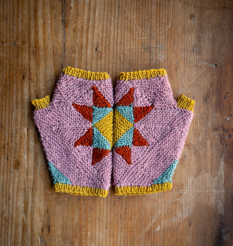 The Wood Block Mitts are a fun and eye catching project reminiscent of block printing and quilting techniques using Modular knitting.